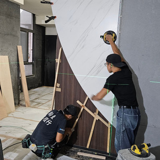 鑫天地二期案場,設計師出了特別的不規則造型主題牆, 這次我們連工帶料,除了薄板安裝外,底座也由我們承攬, 跟設計團隊討論出最適合的基底材,考慮到木作日後的耐用度,擔心蟲蛀及受潮問題,我們選擇用輕鋼架的方式來做造型牆, 今年九月我們成立了自己的工程團隊 " 辰暘工程有限公司 " 服務內容包含:薄板工程/泥作工程/水電工程/輕隔間工程 BPLUS 卡拉拉 霧面薄板,輕薄好加工,耐用度高,很適合做在壁面及檯面,方便好清潔,作在公共區域,除了省去日後大筆的保養費用,更不必擔心質變等自然損壞等煩惱。